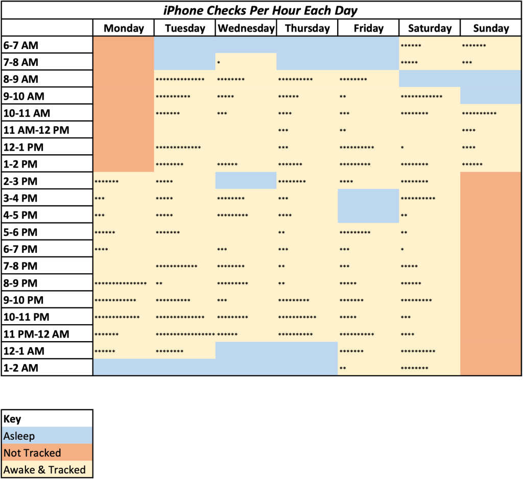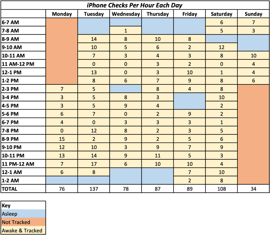 For seven days this past week, I gave up TikTok, Snapchat, Facebook, and Instagram. Then, I created a spreadsheet to track the number of times I checked my phone per hour each day. What I aimed to see was 1) the frequency of my phone checking, 2) any patterns that emerged from day-to-day usage, and 3) if my self-imposed app restrictions would decrease the regularity of my phone checking. Whether it was a harmless tap of my home screen to check the time, or thirty minutes worth of mindless scrolling, I recorded it.