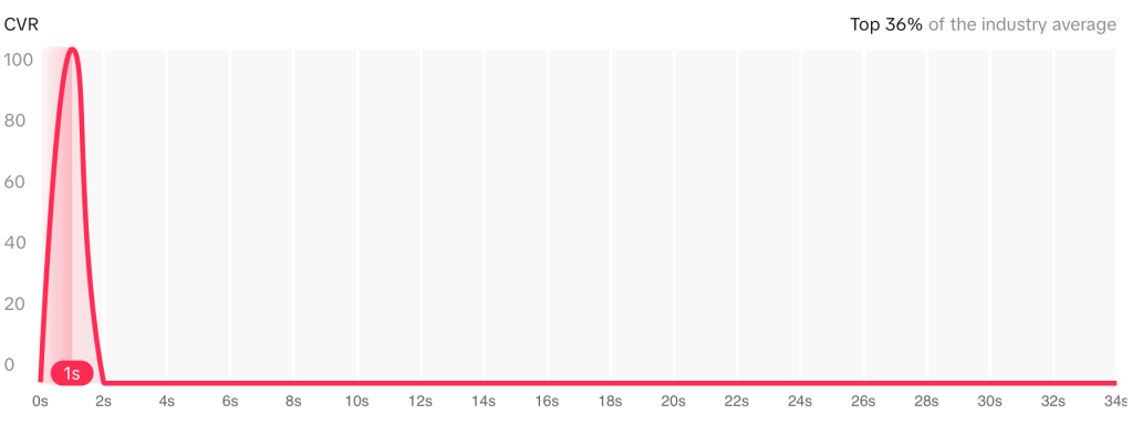 Most conversions occur at the 1-second mark, which implies that users who engage immediately are more likely to take action. The ad ranks in the top 36% of the industry average, which is 0.7% for CVR (Mega Digital, Dec 2024). This is a positive indicator that Poppi’s content is resonating with its audience, and that this ad is relatively effective at driving conversions, but additional refinements – such as a stronger CTA – could further improve results.