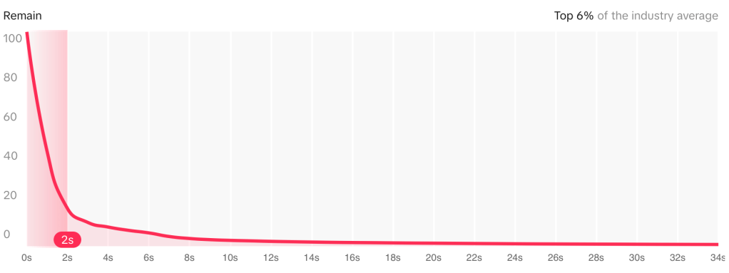 The ad ranks in the top 6% of the industry retention average, which is a strong indicator that it holds audience attention better than most competing ads. However, the sharp drop-off within the first 2 seconds signals a need for a stronger hook to keep viewers engaged.