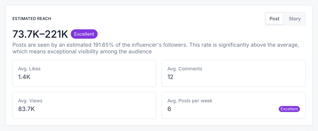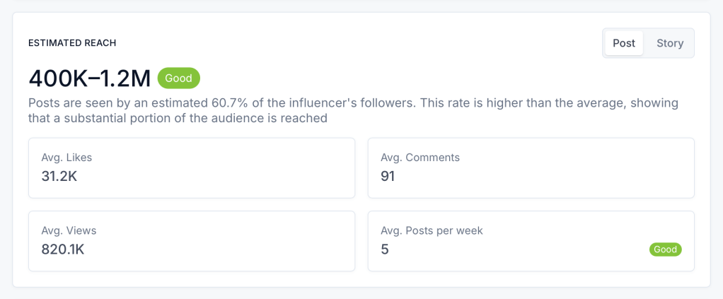 Because Brett’s audience trusts her opinions and follows her for authentic recommendations, this type of long-term ambassador partnership would make the most sense for Hu. Rather than a one-off post, Brett could consistently feature Hu products over time, building brand awareness and reinforcing her followers’ connection to the brand. Plus, her engagement rate and estimated reach are both strong, meaning her content doesn’t just sit there – it sparks conversation and inspires action.