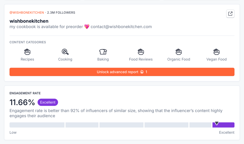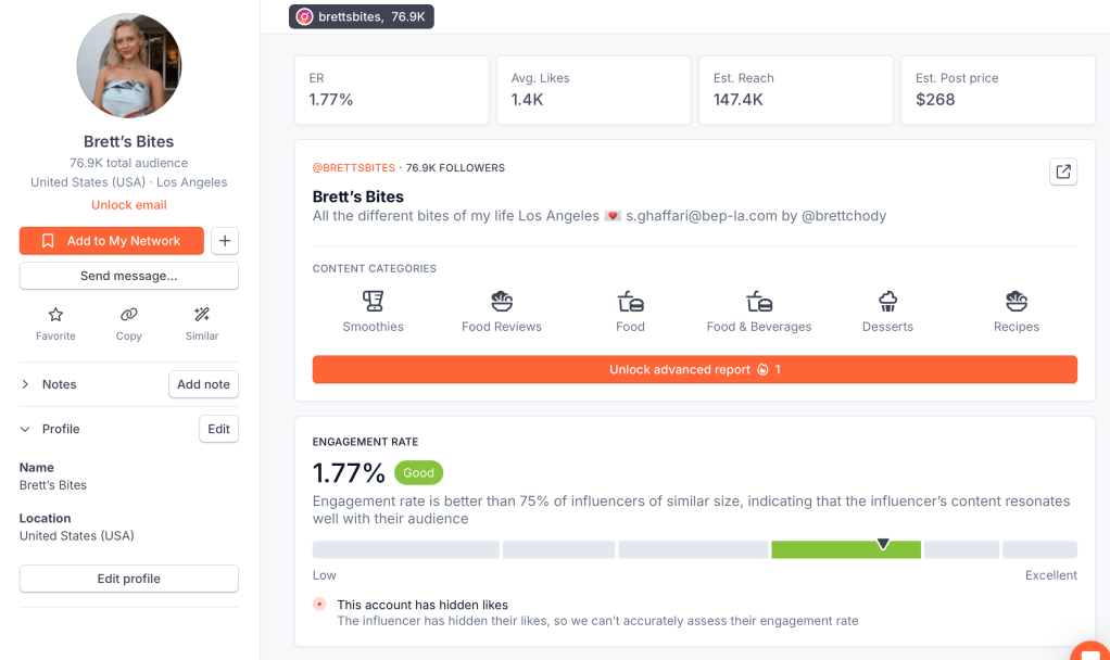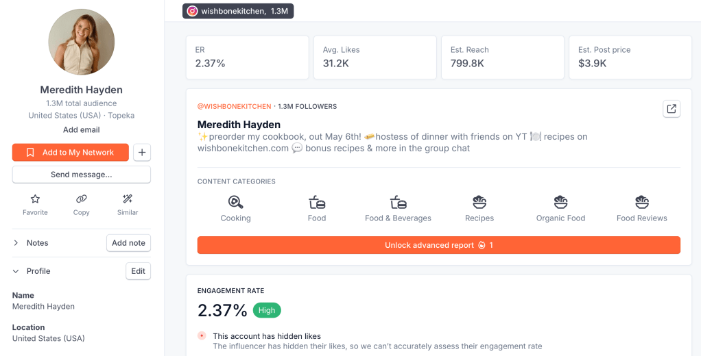 To find the right influencer partners for Hu, I turned to HypeAuditor, a tool that helps evaluate influencers based on metrics like content categories, engagement rates, and estimated reach. After digging into the data, two names stood out: Brett Chody (@brettsbites) and Meredith Hayden (@wishbonekitchen). Both creators bring something special to the table (pun intended), and both could help Hu tap into new audiences in authentic, impactful ways.