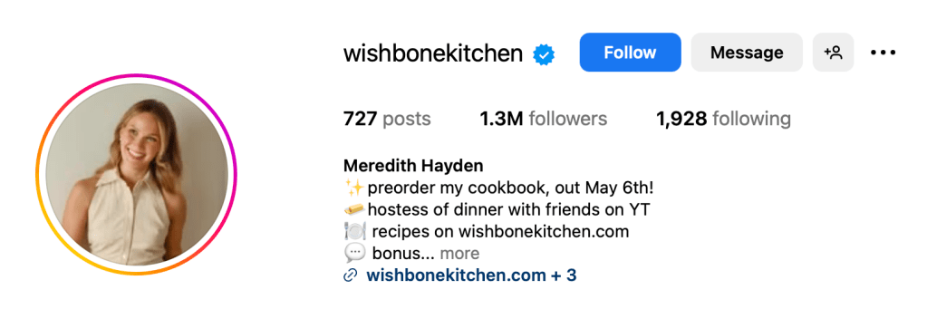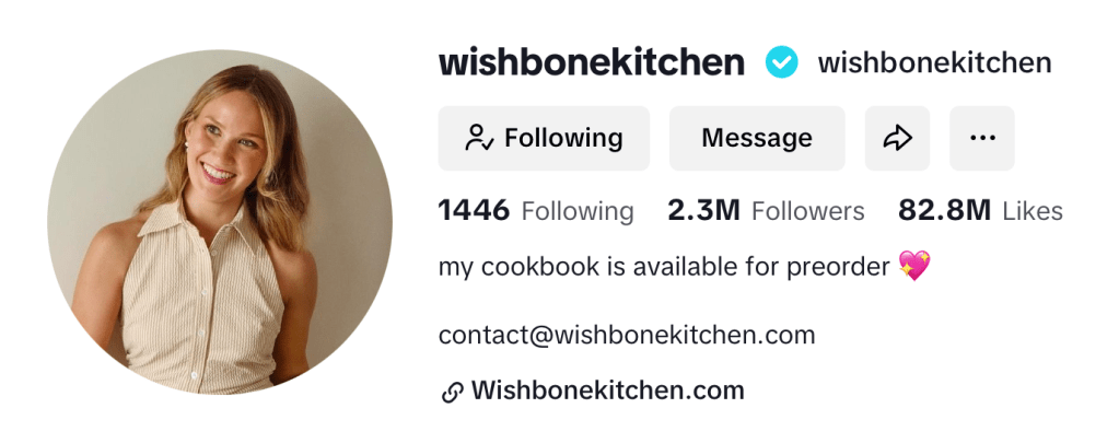If you’re on FoodTok, you probably already know Meredith Hayden, aka wishbonekitchen. With 1.3 million Instagram followers and 2.3 million on TikTok, she’s firmly in macro-influencer territory. Typically, larger influencers struggle to maintain that personal connection with their audience, but Meredith is the exception. Her content feels like a fun, laid-back chat with your foodie friend, even when she’s showing off her professional chef skills.